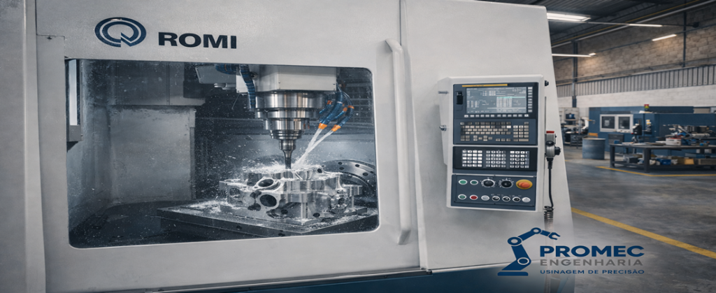 Na Promec Engenharia, a usinagem de precisão é tratada como uma ciência. Atuamos na vanguarda da manufatura subtrativa, utilizando tecnologia CNC (Comando Numérico Computadorizado) para criar componentes com geometrias complexas e acabamentos impecáveis, onde o erro não é uma opção.